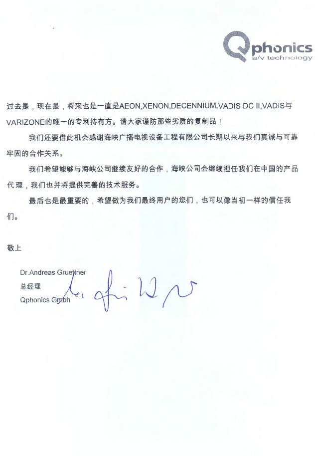 在2010年初,由于當時klotz Digital公司所有者們的管理不善,公司當時財政狀況非常的差,欠下許多債務。公司當時的CEO,Thomas Klotz(托馬斯克洛斯),做為公司的所有者的一員,在無奈之下,不得不賣掉klotz Digital公司。但是到了今天,Thomas Klotz(托馬斯克洛斯)在Qphonics公司(即之前的Klotz Digital)客戶已不再擁有任何股份。因此Thomas Klotz(托馬斯克洛斯)無權(quán)使用該公司的任何技術(shù)專利,這些專利包括我們目前的主要廣播設備產(chǎn)品,如AEON,XENON,DECENNIUM和VADIS D.C.II調(diào)音臺,VADIS的調(diào)音頻路由器系統(tǒng)與VARZONE的擴聲系統(tǒng),包括VADIS software軟件和其他即插即用軟件配件。綜上所說,Thomas Klotz(托馬斯克洛斯)無資格,也不允許從事產(chǎn)品的生產(chǎn)銷售。同時Qphonics公司內(nèi)部的情形他更不可能再知道了,再談不上他可以得到任何與Qphonics公司或公司產(chǎn)品有關(guān)的可靠信息。就像他說某某產(chǎn)品停產(chǎn)了,他從何得知?他無權(quán)散布這樣的謠言。