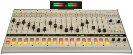 我們現(xiàn)在使用的是Logitek 16路數(shù)字調(diào)音臺,如下圖所示,這是一個調(diào)音臺的推子模塊,里面包含了兩路推子,可以看到這里有很多功能鍵,我們用到的就是推子的開關(guān)鍵ON/OFF、推子、CUE本機預聽和液晶顯示屏