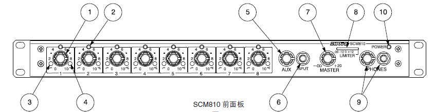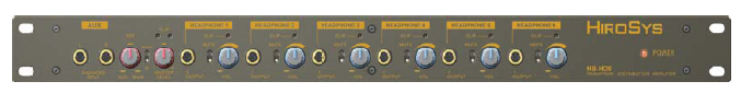 前面板上設置了6組可獨立調(diào)節(jié)音量的6.3mm立體聲耳機輸出插座,每一輸出組上設置一個峰值信號指示燈,當指示燈閃亮時,表示信號過大,可以通過調(diào)節(jié)對應的旋鈕順時針(調(diào)大),逆時針(調(diào)?。﹣碚{(diào)整。