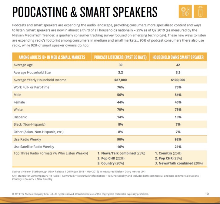 雖然在某些圈子里,農(nóng)村地區(qū)在采用新技術(shù)方面的速度較慢,但尼爾森表示,這些市場(chǎng)內(nèi)的消費(fèi)者是“老練的音頻用戶”,他們還在日常生活中加入了播客和智能音箱。當(dāng)你考慮到新聞/熱心廣播節(jié)目是第二受歡迎的廣播格式時(shí)(在中小市場(chǎng)占11.8%),這些消費(fèi)者對(duì)播客的喜愛(ài)也是情理之中的。然而,這些聽(tīng)眾并沒(méi)有放棄廣播。