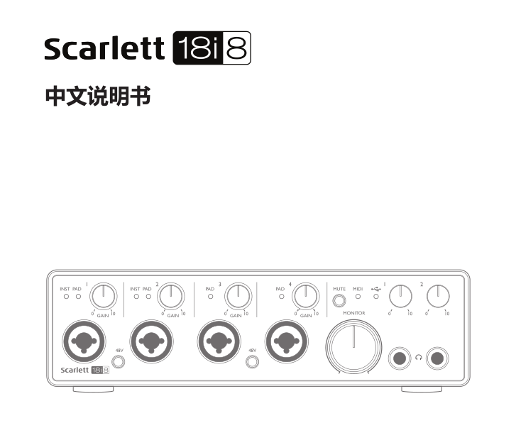 感謝閣下購(gòu)買第二代Scarlett 18i8。作為Focusrite專業(yè)音頻接口產(chǎn)品的一員,Scarlett 18i8集成了Focusrite高品質(zhì)模擬前置放大器,與配套的Focusrite Control應(yīng)用軟件搭配使用,讓你擁有一套緊湊而且功能強(qiáng)大的高品質(zhì)電腦音頻傳輸方案。你也可以通過Focusrite Control軟件把Scarlett 18i8設(shè)置為獨(dú)立音頻接口和其他類型錄音設(shè)備連接使用。