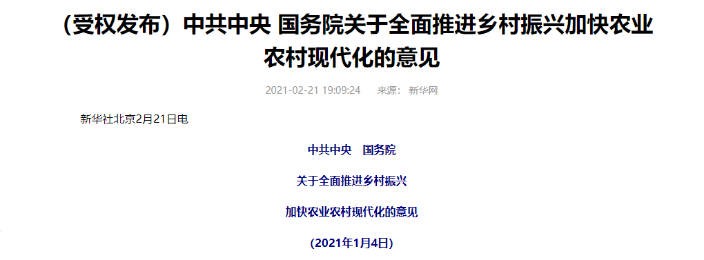 日前,新華網(wǎng)受權(quán)發(fā)布中共中央 國(guó)務(wù)院關(guān)于全面推進(jìn)鄉(xiāng)村振興加快農(nóng)業(yè)農(nóng)村現(xiàn)代化的意見(jiàn),即2021年中央一號(hào)文件發(fā)布,文件指出,民族要復(fù)興,鄉(xiāng)村必振興。要堅(jiān)持把解決好“三農(nóng)”問(wèn)題作為全黨工作重中之重,把全面推進(jìn)鄉(xiāng)村振興作為實(shí)現(xiàn)中華民族偉大復(fù)興的一項(xiàng)重大任務(wù),舉全黨全社會(huì)之力加快農(nóng)業(yè)農(nóng)村現(xiàn)代化,讓廣大農(nóng)民過(guò)上更加美好的生活。