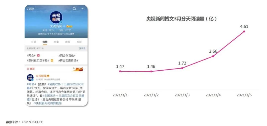 十三屆全國人大四次會(huì)議開幕當(dāng)天,央視新聞微博博文單日閱讀量達(dá)到4.61億,較前一天提升73%,單日閱讀量為近兩周新高。