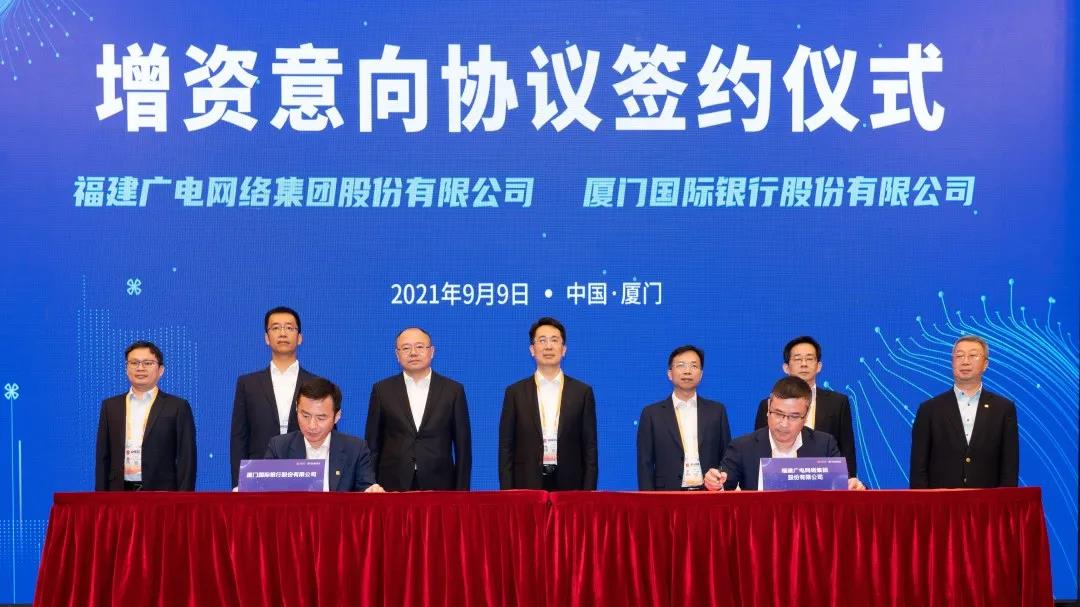9月9日,福建廣電網(wǎng)絡(luò)集團(tuán)與廈門國(guó)際銀行簽訂增資意向協(xié)議,福建廣電網(wǎng)絡(luò)集團(tuán)黨委書記、董事長(zhǎng)蔡琳,黨委副書記、總經(jīng)理黃葦洲,廈門國(guó)際銀行黨委書記、董事長(zhǎng)王曉健,黨委副書記、行長(zhǎng)章德春等領(lǐng)導(dǎo)出席簽約儀式。福建廣電網(wǎng)絡(luò)集團(tuán)總會(huì)計(jì)師方友愛(ài)與廈門國(guó)際銀行副行長(zhǎng)黃大慶代表雙方進(jìn)行簽約。