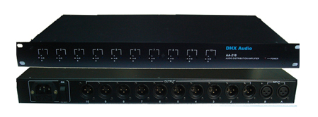 DHX AA210音頻放大器設(shè)有2路輸入和10路輸出。每路輸出均可獨(dú)立設(shè)定為連接輸入A(左聲道)、輸入B(右聲道)或左右聲道混音A+B成為單聲道,該設(shè)定可于前面板中選擇。