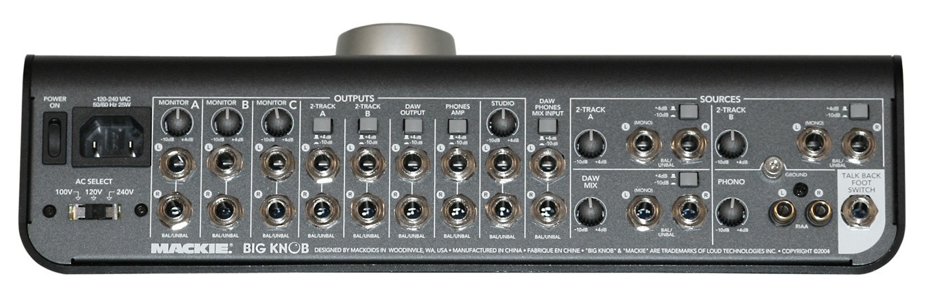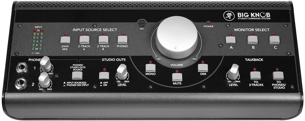 Mackie公司的錄音室指令控制器Big Knob,是一款及監(jiān)聽電平、控制監(jiān)聽、切換監(jiān)聽、聽源選擇、錄音室對(duì)講雙監(jiān)聽、耳機(jī)輸出唱機(jī)于一體的前置放大器。