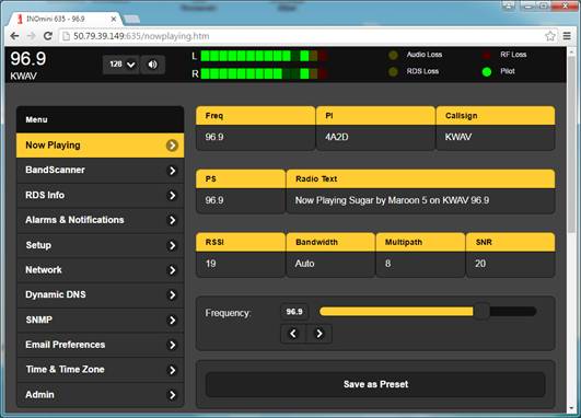 INOmini635是自帶有瀏覽器頁面的用于遠(yuǎn)程信號監(jiān)測FM信號接收器。將它部署在發(fā)射機(jī)站點或任何關(guān)鍵地理位置,它能夠收集信息并把無線電音頻或有線音頻發(fā)送到任何計算機(jī),平板電腦或移動設(shè)備。瀏覽器頁面能實現(xiàn)遠(yuǎn)程調(diào)整,顯示音頻電平以及RDS數(shù)據(jù),并記錄信號參數(shù)。參數(shù)和警報可通過電子郵件,短信和SNMP協(xié)議發(fā)送。INOmini635還支持滾動監(jiān)測Station Rotation?,能夠遍歷儲存的預(yù)設(shè)并根據(jù)各自的設(shè)定發(fā)送報警。歡迎前來體驗INOmini635強(qiáng)大的遠(yuǎn)程控制,只需按照在Web瀏覽器此鏈接即可全權(quán)控制一臺位于美國加州的儀器:model635.no-ip.org,進(jìn)入網(wǎng)頁后您將看到效果如下圖。您也可以點擊播放按鈕來收聽實時廣播。