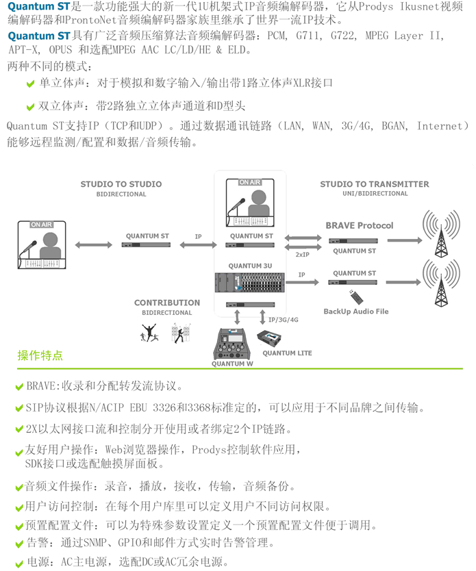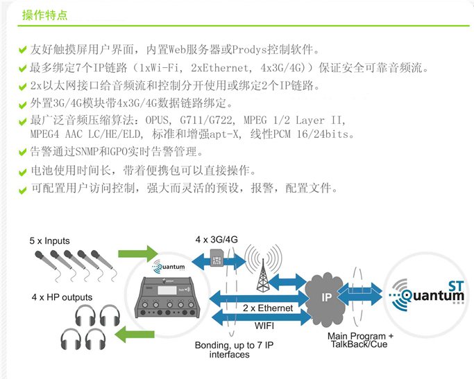 Quantum:從Prodys Ikusnet視頻解碼器家族繼承了世界一流IP技術(shù):自動抖動緩沖、自適應(yīng)比特率、綁定7個IP鏈路(以太網(wǎng)、3G/4G、Wi-Fi)保證最佳音頻質(zhì)量。
