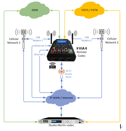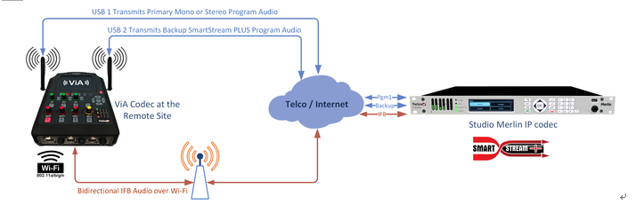 VIA 與Merlin或MerlinPLUS音頻編解碼器完美結合,可以傳輸高音質的音頻——全雙工立體聲節(jié)目的音頻和一個獨立的雙向IFB通訊鏈路。舉個例子,你可以使用一個USB Modem傳輸播出節(jié)目;同時,使用另一個USB Modem或者Wi-Fi傳輸您的IFB通訊。
