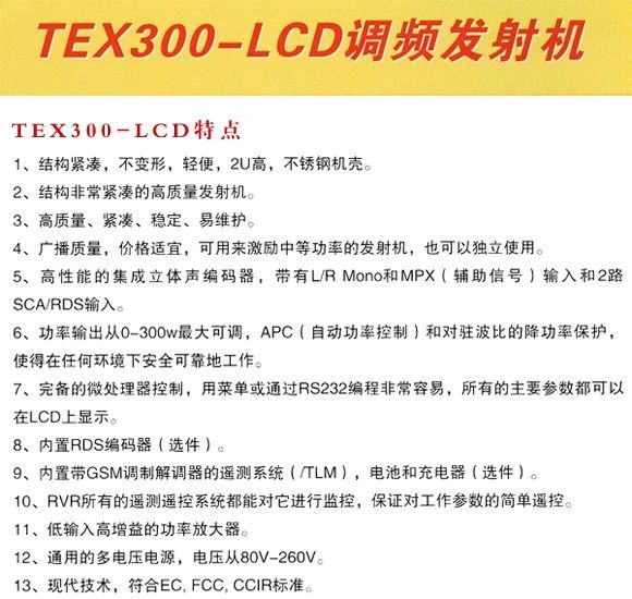產(chǎn)品簡(jiǎn)介:TEX300LCD 300W一體化調(diào)頻發(fā)射機(jī)