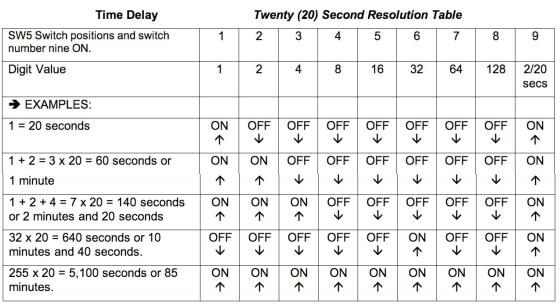 警報延遲時間段是有效音頻失敗到觸發(fā)警報之間的時間。 SilenceSentinel?Standard的警報時間延遲是使用設(shè)備背面SW5撥碼開關(guān)的前9個位置設(shè)置的。下表提供了兩種第二分辨率設(shè)置。要提供更長的時間分辨率,請打開SW5開關(guān)9,這將提供20秒的分辨率。對于出廠默認設(shè)置,如下面的兩秒分辨率表所示,我們已將開關(guān)1和2設(shè)為ON。每個開關(guān)都有一個數(shù)字值,如下兩表所示。請遵循下面的兩秒分辨率表。我們將這些數(shù)字值相加以獲得總數(shù)字值??倲?shù)字值乘以分辨率值(兩秒或二十秒)即可獲得延遲時間。