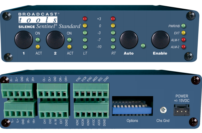 SilenceSentinel?Standard上的兩個輸入均會受到音頻電平的持續(xù)監(jiān)控。 如果輸入的音頻高于靜音感應(yīng)閾值,則其ACT LED將點亮;如果輸入的音頻低于閾值,則ACT LED將熄滅。 如果輸入音頻在配置的警報延遲時間內(nèi)仍低于閾值,則其警報LED和警報集電極開路輸出(ALM1或ALM2)將激活,以表示該輸入沒有聲音。