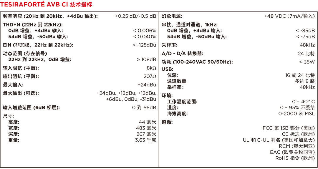 進(jìn)的會議解決方案。TesiraFORTéAVBCI使用音頻視頻橋接(AVB)數(shù)字音頻網(wǎng)絡(luò)、和可以用作獨立設(shè)備,或與其他TesiraFORTé設(shè)備、TesiraDSPs、擴展器和控制器相結(jié)合使用。TesiraFORTéAVBCI還提供了廣泛的音頻處理,包括但不限于:信號路由和混音、均衡、濾波、動態(tài)和延遲以及控制、監(jiān)控和診斷工具,均通過Tesira軟件配置。TesiraFORTéAVBCI是中小型房間的最佳選擇,這類房間需要使用語言擴聲和分區(qū)擴聲的高品質(zhì)音頻解決方案(如會議室或理事會會議廳)。