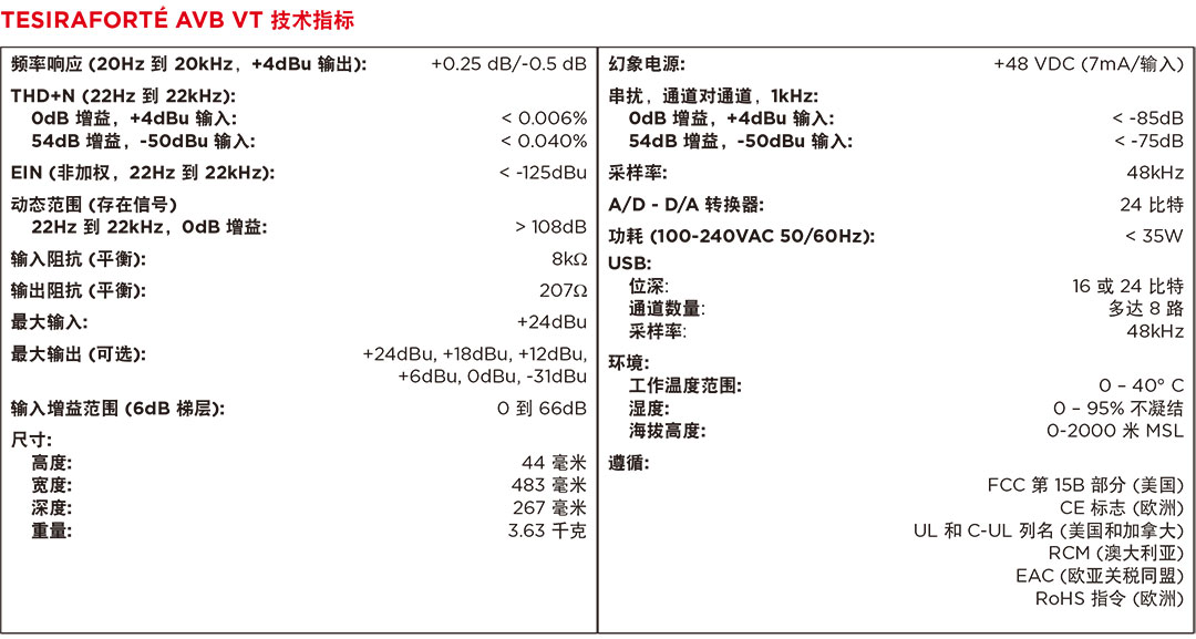 TesiraFORTé?AVBVT是一款固定的I/ODSP,配備12路支持回聲消除(AEC)的模擬輸入和8路模擬輸出,并包含多達8路可配置USB音頻通道,一個雙通道VoIP接口和一個標準FXO電話接口。借助USB音頻,TesiraFORTé直接與USB音頻主機連接,并可充分利用當今最先進的會議解決方案。TesiraFORTéAVBVT使用音頻視頻橋接(AVB)數(shù)字音頻網(wǎng)絡、和可以用作獨立設備,或與其他TesiraFORTé設備、TesiraDSPs、擴展器和控制器相結(jié)合使用。TesiraFORTéAVBVT還提供了廣泛的音頻處理,包括但不限于:信號路由和混音、均衡、濾波、動態(tài)和延遲以及控制、監(jiān)控和診斷工具,均通過Tesira軟件配置。TesiraFORTéAVBVT最適合需要使用VoIP、放大聲音、混音和AEC的高品質(zhì)音頻解決方案的房間。